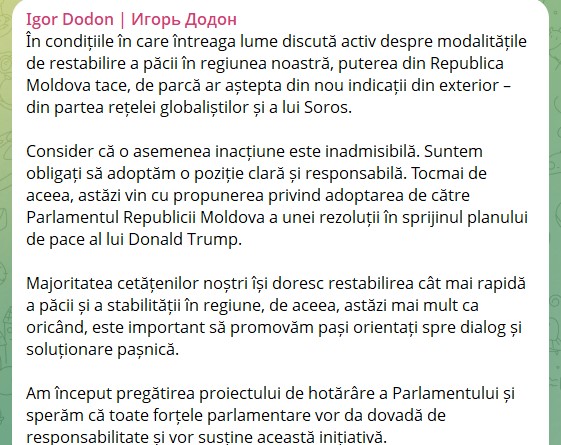 Consider că o asemenea inacțiune este inadmisibilă. Suntem obligați să adoptăm o poziție clară și responsabilă. Tocmai de aceea, astăzi vin cu propunerea privind adoptarea de către Parlamentul Republicii Moldova a unei rezoluții în sprijinul planului de pace al lui Donald Trump.