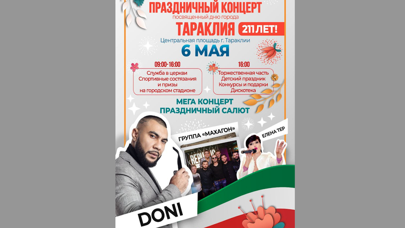 "Ziua orașului, conform tradiției, o vom începe cu o slujbă în biserică. La ora 12:00 va avea loc o depunere de flori la rotonda din Parcul Gagarin. Apoi, copiii și adulții sunt așteptați la concursuri, competiții sportive cu premii și diverse jocuri, discotecă, iar seara - un mare concert", a spus el. Programul festiv organizat de echipa lui Ilan Șor va dura toată ziua: de la ora 9.00 la 16.00 vor avea loc concursuri sportive cu premii pe stadion, urmate de activități pentru copii, discotecă, un mega concert și focuri de artificii în Piața Principală. "Capii de afiș ai concertului vor fi cântărețul DONI, grupul "Mahagon" și interpreta Elena Ter. Această sărbătoare este un bun prilej de a reuni familiile și de a petrece timpul împreună!" - a conchis deputatul Vadim Fotescu.