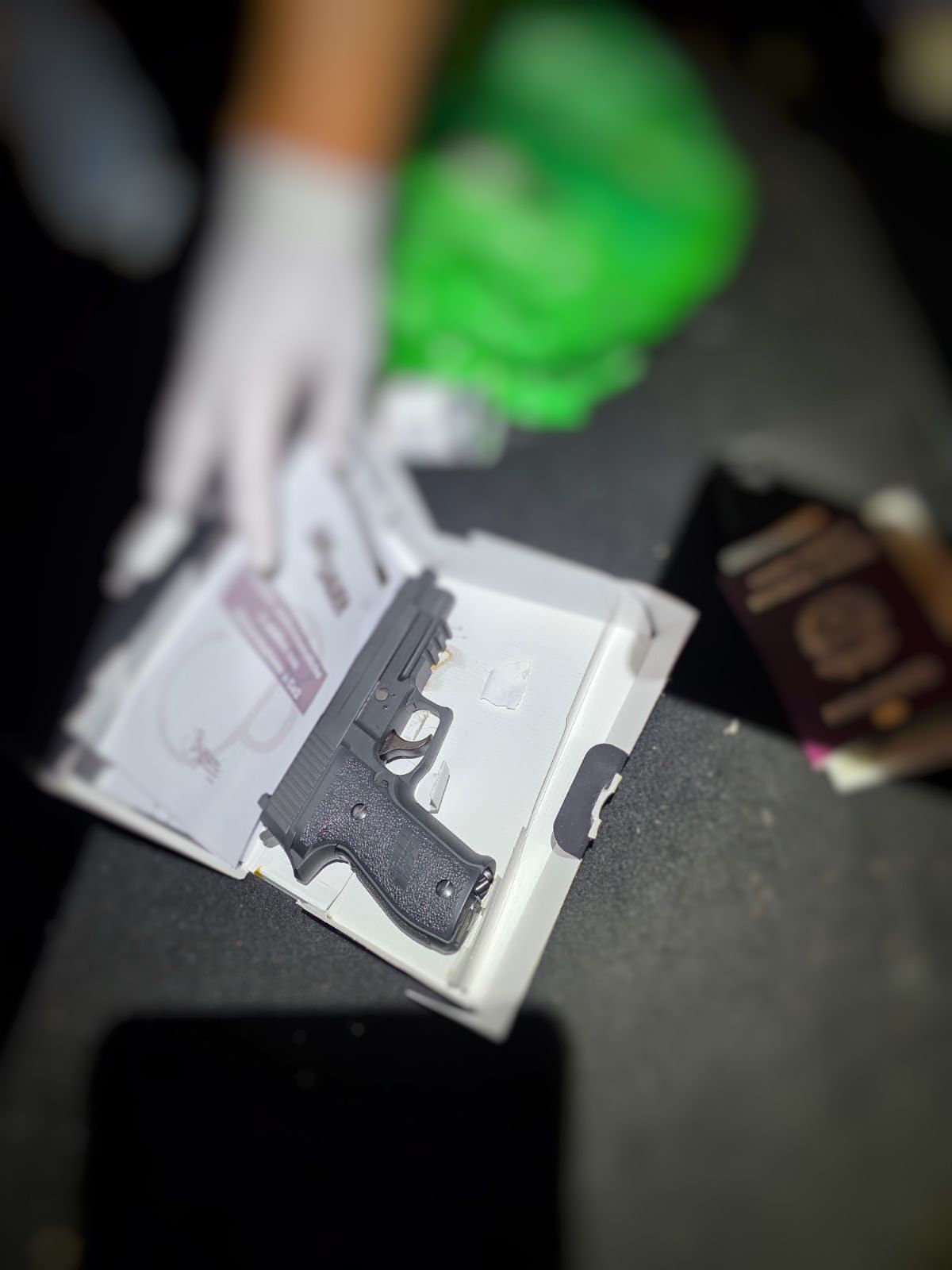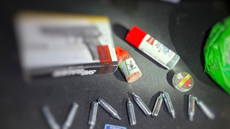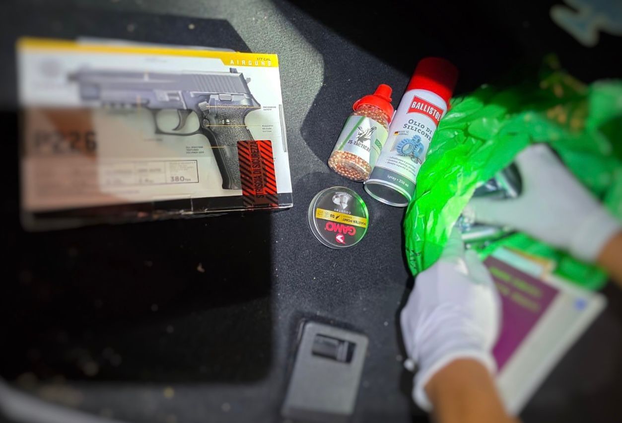 În ascunzătoare au fost găsite: un pistol pneumatic cu calibrul 4,5 mm, 1.479 bile de același calibru, 454 capse din plumb, un încărcător gol și un spray de 200 ml. Toate obiectele erau nedeclarate autorității vamale.