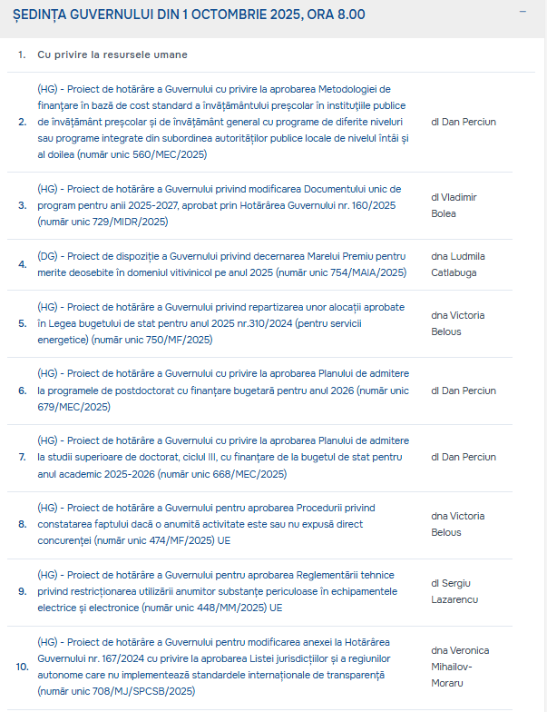 Guvernul s-a întrunit astăzi, 1 octombrie, în ședință. Pe ordinea de zi au figurat 17 de subiecte.