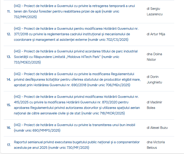 update Proiectul de hotărâre a Guvernului privind acordarea titlului de parc industrial Societății cu Răspundere Limitată „Moldova HiTech Park” (număr unic 733/MDED/2025), aprobat.