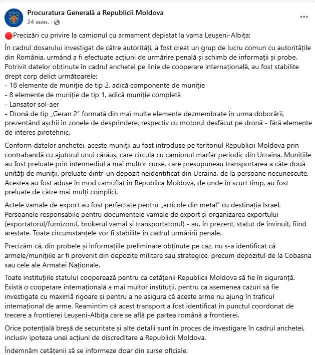 Toate instituțiile statului cooperează pentru ca cetățenii Republicii Moldova să fie în siguranță. Există o cooperare internațională a mai multor instituții, pentru ca asemenea cazuri să fie investigate cu maximă rigoare și pentru a ne asigura că aceste arme nu ajung în traficul internațional de arme. Reamintim că acest transport a fost identificat în punctul coordonat de trecere a frontierei Leușeni-Albița care se află pe partea română a frontierei.