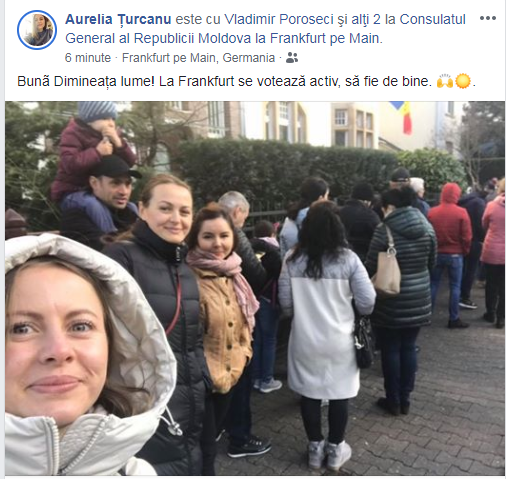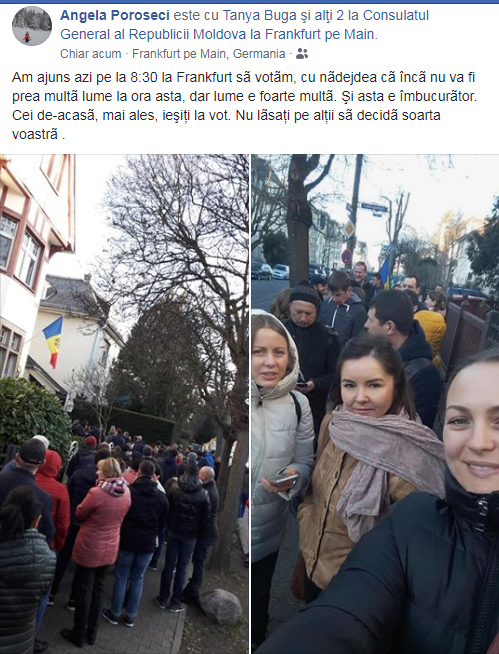 Diaspora votează! Dacă la București, potrivit unor martori, prezența este slabă. Atunci, la Consulatul Republicii Moldova din Frankfurt, prezența este mai mare. Zeci de moldoveni stau la coadă și așteaptă să voteze.
