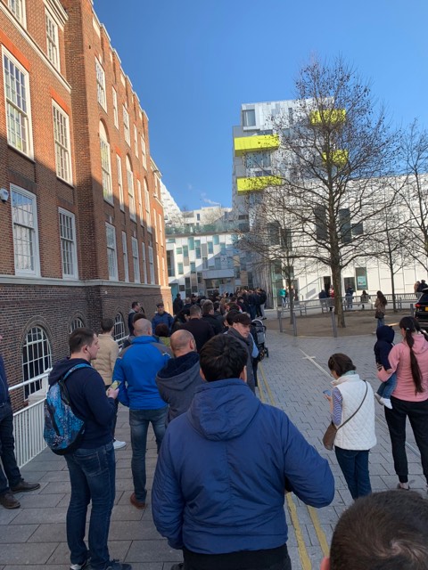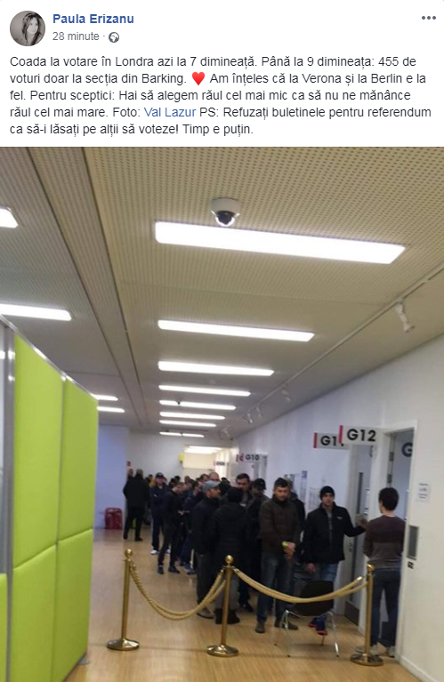 (update 11:30) Paula Erizanu, stundentă în Londra:„ Coada la votare în Londra azi la 7 dimineață. Până la 9 dimineața: 455 de voturi doar la secția din Barking”.