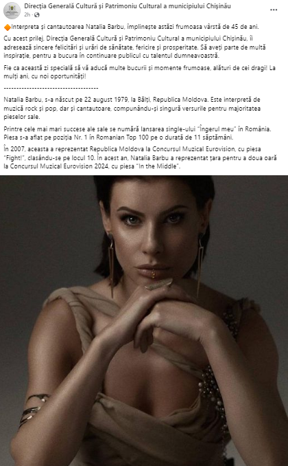 Fie ca această zi specială să vă aducă multe bucurii și momente frumoase, alături de cei dragi. La mulți ani, cu noi oportunități”, se arată în comunicatul emis de Direcția Generală Cultură și Patrimoniu Cultural a municipiului Chișinău.