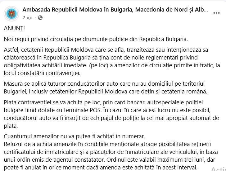 .Potrivit noilor reguli, amenzile de circulație trebuie achitate imediat, la locul constatării contravenției, de către toți conducătorii auto care nu au domiciliul în Bulgaria. Măsura se aplică inclusiv cetățenilor Republicii Moldova care dețin și cetățenie română.