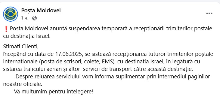 „Stimați Clienți, începând cu data de 17.06.2025, se sistează recepționarea tuturor trimiterilor poștale internaționale (poșta de scrisori, colete, EMS), cu destinația Israel, în legătură cu sistarea traficului aerian și altor servicii de transport către această destinație.