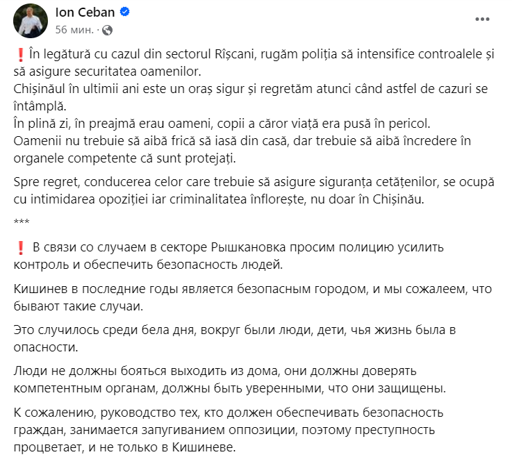 Oamenii nu trebuie să aibă frică să iasă din casă, dar trebuie să aibă încredere în organele competente că sunt protejați”, se arată în mesajul lui Ion Ceban.