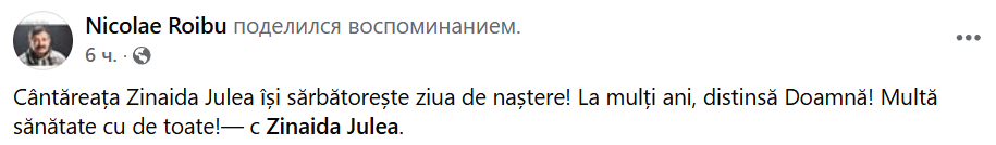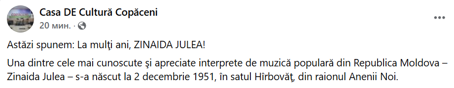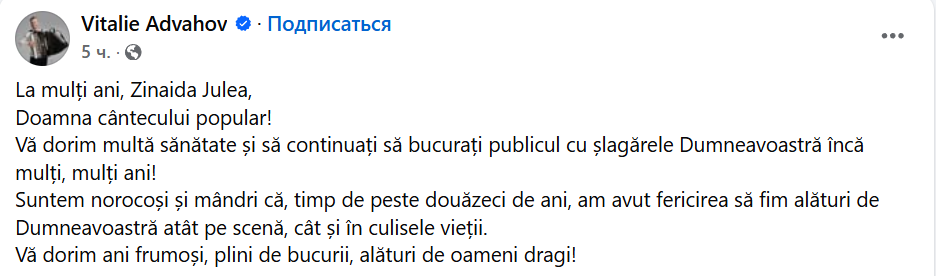 „Astăzi omagiem una dintre cele mai îndrăgite și carismatice voci ale folclorului nostru – pe inconfundabila Zinaida Julea, artista care, de fiecare dată când urcă pe scenă, transformă emoția în sărbătoare și ridică publicul în picioare.