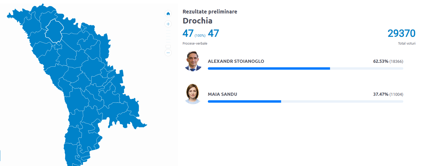 Respectiv, pentru Alexandr Stoianoglo și-au dat votul 62,53% ( 18.366 alegători).