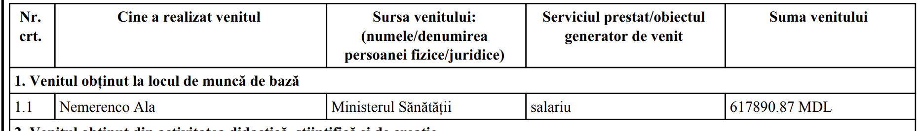 Venitul de bază al lui Nemerenco ar fi salariul de funcție de la Ministerul Sănătății.