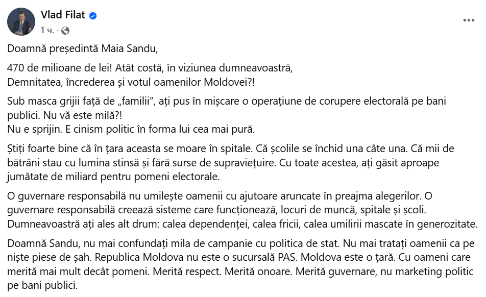 Doamnă Sandu, nu mai confundați mila de campanie cu politica de stat. Nu mai tratați oamenii ca pe niște piese de șah. Republica Moldova nu este o sucursală PAS. Moldova este o țară. Cu oameni care merită mai mult decât pomeni. Merită respect. Merită onoare. Merită guvernare, nu marketing politic pe bani publici”, a menționat liderul PLDM.