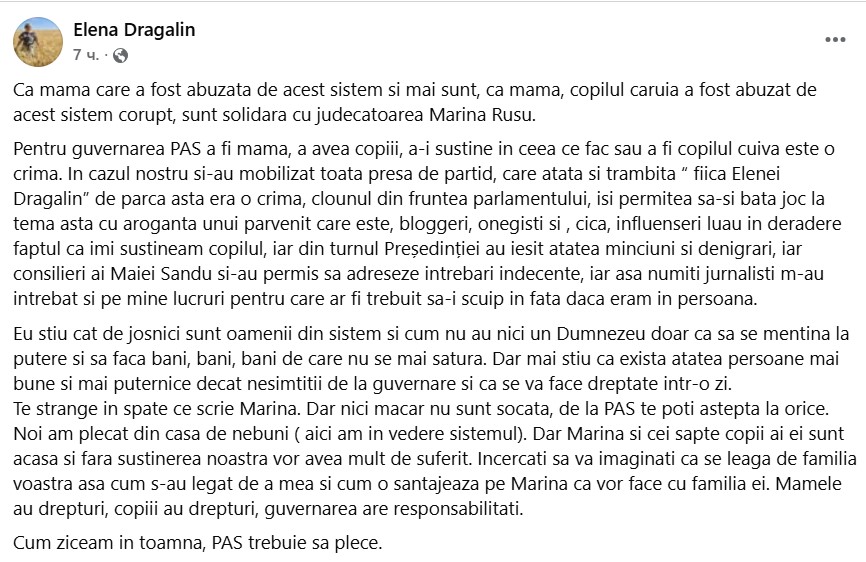 Activista Elena Dragalin și-a exprimat solidaritatea cu judecătoarea Marina Rusu, criticând dur guvernarea pentru modul în care tratează familiile și copiii acestora. „Eu știu cât de josnici sunt oamenii din sistem și că nu au niciun Dumnezeu, doar ca să se mențină la putere și să facă bani, bani, bani, de care nu se mai satură”, a scris mama foste șefe PA.