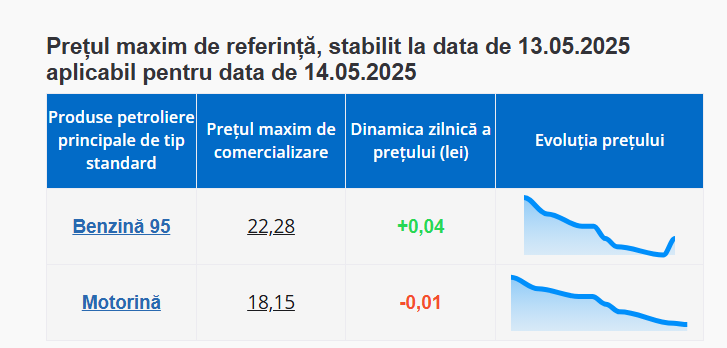 - 22,28 lei/litru - pentru benzina COR 95 (+ 4 bani); - 18,15 lei/litru - pentru motorina standard (- 1 ban).