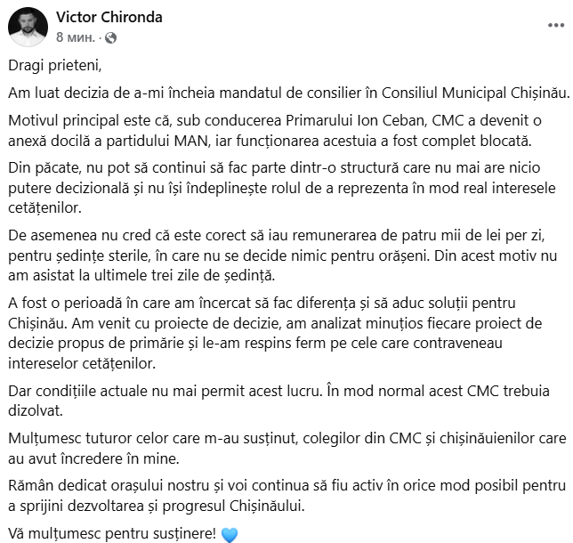 Am luat decizia de a-mi încheia mandatul de consilier în Consiliul Municipal Chișinău.