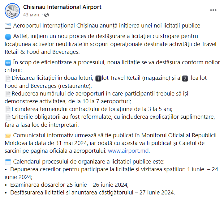 Comunicatul informativ urmează să fie publicat în Monitorul Oficial al Republicii Moldova la data de 31 mai 2024, iar odată cu acesta va fi publicat și Caietul de sarcini pe pagina oficială a aeroportului: www.airport.md.