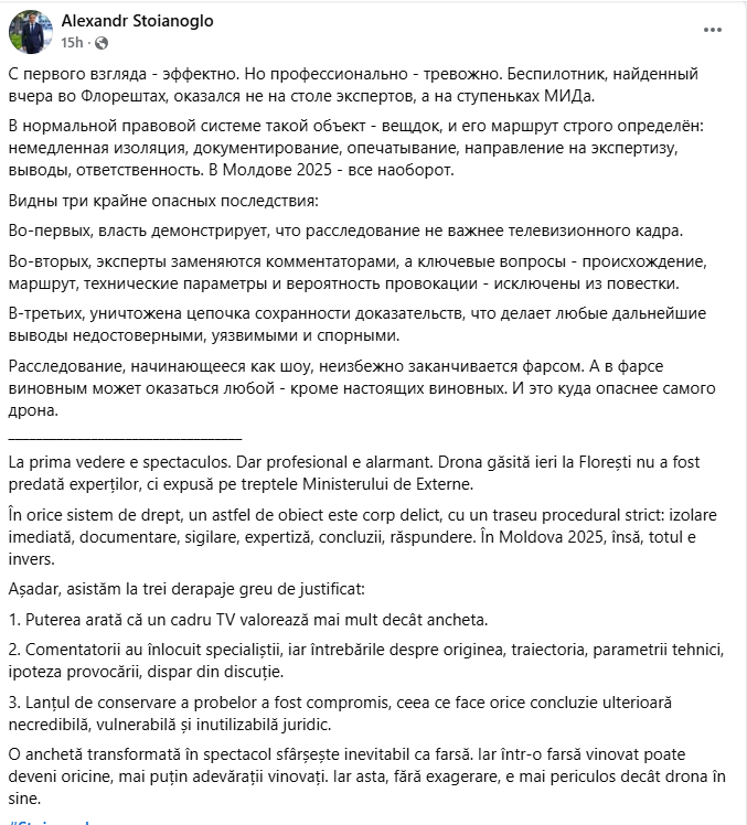 O anchetă transformată în spectacol sfârșește inevitabil ca farsă. Iar într-o farsă vinovat poate deveni oricine, mai puțin adevărații vinovați. Iar asta, fără exagerare, e mai periculos decât drona în sine”, a subliniat Alexandr Stoianoglo.