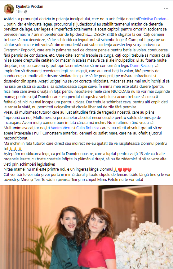 Dorin Recean, vă implorăm să dispuneți revederea legii, ca ucigașii, care au urcat beți la volan, fără permis de conducere, cu multe alte dosare similare în spate, să fie pedepsiți pe măsura infracțiunii și dosarelor din spate. Acești ucigași nu se vor corecta niciodată, măcar să stea mai mult închiși și să nu iasă pe străzi să ucidă și să schilodească copiii cuiva. În inima mea este atâta durere (pentru fiica mea care avea o viață în față; pentru nepoțelele mele care NICIODATă nu își vor mai cuprinde mama; pentru soțul Doiniței, care și-a pierdut dragostea vieții lui și acum trebuie să crească fetițele) că nici nu mai încape ura pentru ucigaș. Dar trebuie schimbat ceva, pentru alți copii: dați-le șansa la viață, nu permiteți ucigașilor să circule liber ani de zile fără permise….