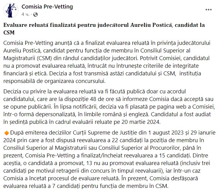 „Decizia cu privire la evaluarea reluată va fi făcută publică doar cu acordul candidatului, care are la dispoziție 48 de ore să informeze Comisia dacă acceptă sau se opune publicării. În lipsa notificării, decizia va fi plasată pe pagina web a Comisiei, într-o formă depersonalizată, în limbile română și engleză. Candidatul a fost audiat în ședință publică în cadrul evaluării reluate pe 20 martie 2024.