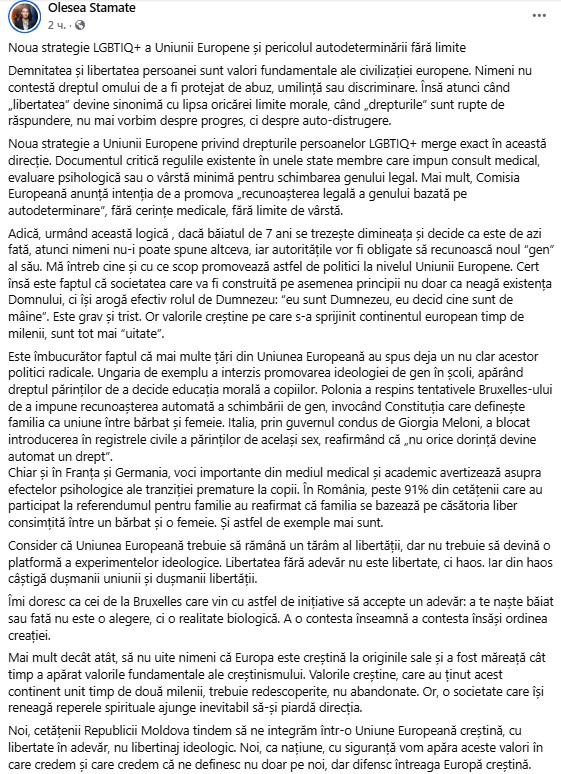 Noi, cetățenii Republicii Moldova, tindem să ne integrăm într-o Uniune Europeană creștină, cu libertate în adevăr, nu cu libertinaj ideologic. Noi, ca națiune, cu siguranță vom apăra aceste valori în care credem și care, credem noi, definesc nu doar identitatea noastră, ci și întreaga Europă creștină”, a scris Olesea Stamate.