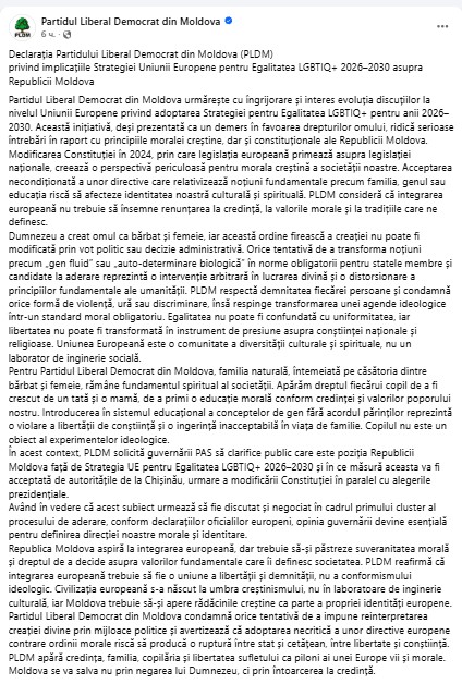 „Partidul Liberal Democrat din Moldova urmărește cu îngrijorare și interes evoluția discuțiilor la nivelul Uniunii Europene privind adoptarea Strategiei pentru Egalitatea LGBTIQ+ pentru anii 2026–2030. Această inițiativă, deși prezentată ca un demers în favoarea drepturilor omului, ridică serioase întrebări în raport cu principiile moralei creștine, dar și constituționale ale Republicii Moldova.
