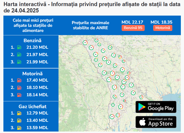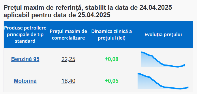 Astfel, un litru de benzină va costa 22,25 lei, iar cel de motorină - 18,40lei.