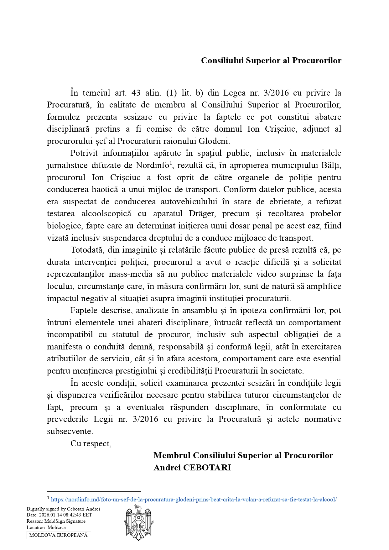 „În calitate de membru al Consiliului Superior al Procurorilor, m-am autosesizat din oficiu în legătură cu informațiile apărute în spațiul public privind cazul procurorului din cadrul Procuraturii raionului Glodeni, surprins conducând în stare de ebrietate, caz documentat de presă.