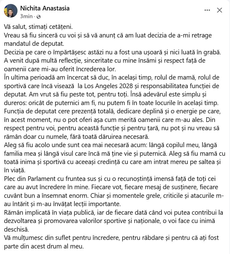 În ultima perioadă am încercat să duc, în același timp, rolul de mamă, rolul de sportivă care încă visează la Los Angeles 2028 și responsabilitatea funcției de deputat. Am vrut să fiu peste tot, pentru toți. Însă adevărul este simplu și dureros: oricât de puternici am fi, nu putem fi în toate locurile în același timp.