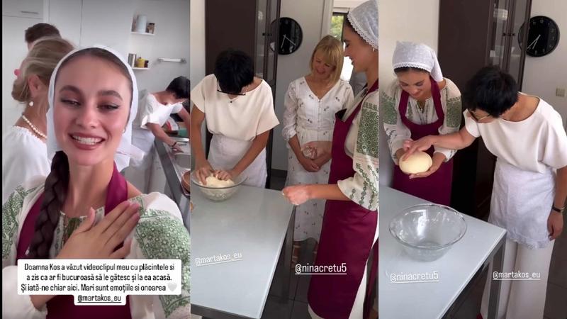 „Doamne, am niște emoții, suntem în casa doamnei Kos... Ea a văzut video-ul meu cum eu fac plăcinte și m-a rugat să fac și la ea acasă”, a spus Nina Crețu.