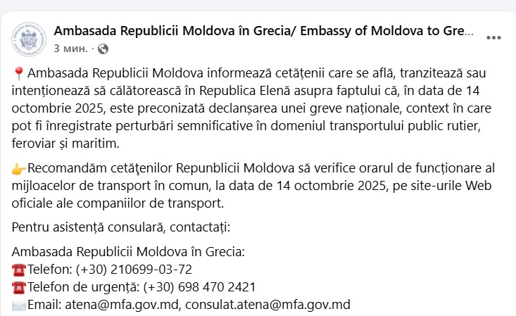 În acest context, autoritățile recomandă cetățenilor moldoveni care se află deja în Grecia, tranzitează teritoriul elen sau intenționează să călătorească în această perioadă să consulte din timp orarul mijloacelor de transport public. Informațiile actualizate pot fi accesate pe site-urile oficiale ale companiilor de transport.