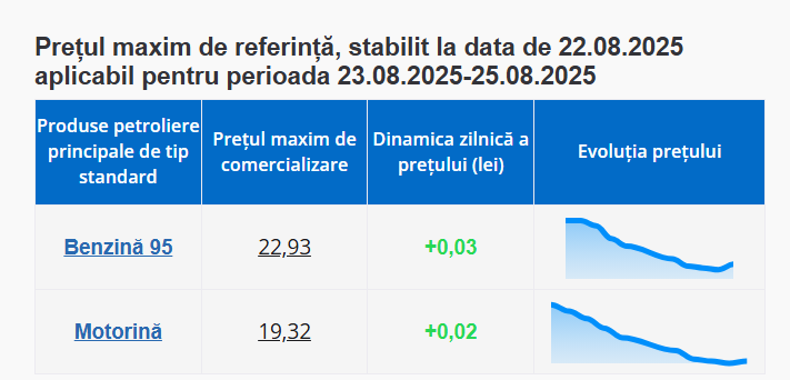 Astfel, un litru de benzină va costa în weekend 22,93 lei, iar un litru de motorină va putea fi procurat cu 19,32 lei.