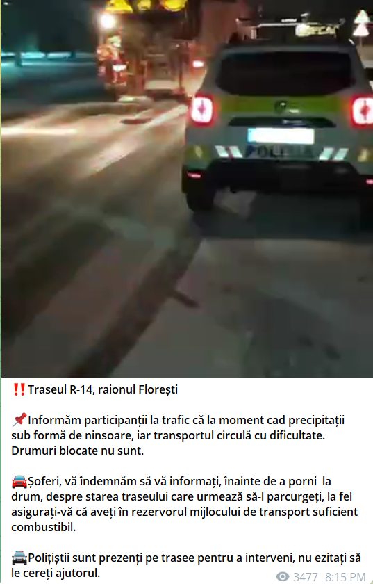 Informăm participanții la trafic că la moment cad precipitații sub formă de ninsoare, iar transportul circulă cu dificultate. Drumuri blocate nu sunt.