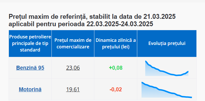 Astfel, litrul de benzină va costa 23,06 de lei, iar unul de motorină - 19,61 lei.