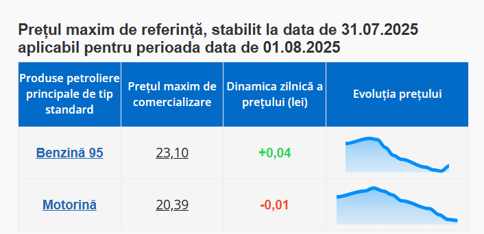Agenția Națională pentru Reglementare în Energetică (ANRE) a afișat noile prețuri la carburanți pentru mâine, 1 august. Potrivit Acestora, benzina va fi mai scumpă, iar motorina continuă să se ieftinească.
