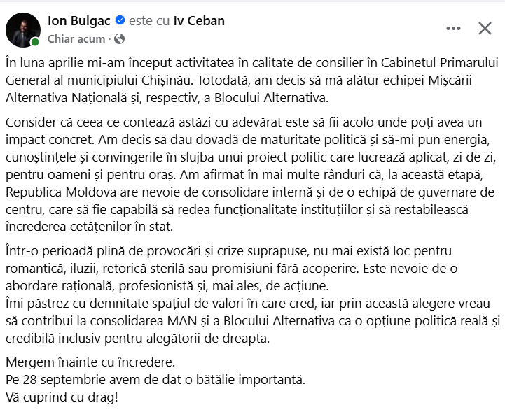 Îmi păstrez cu demnitate spațiul de valori în care cred, iar prin această alegere vreau să contribui la consolidarea MAN și a Blocului Alternativa ca o opțiune politică reală și credibilă inclusiv pentru alegătorii de dreapta”, a scris Bulgac pe rețele.