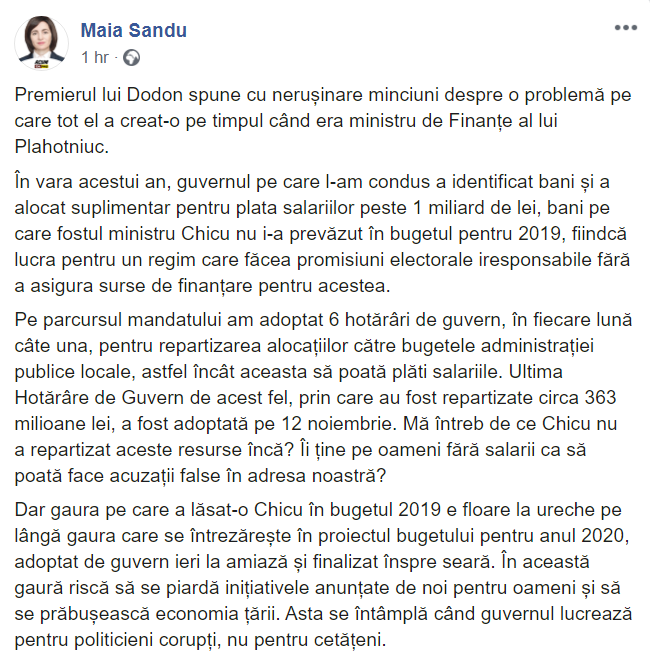 Pe de altă parte, Maia Sandu a scris: „Pe parcursul mandatului am adoptat 6 hotărâri de guvern, în fiecare lună câte una, pentru repartizarea alocațiilor către bugetele administrației publice locale, astfel încât aceasta să poată plăti salariile. Ultima Hotărâre de Guvern de acest fel, prin care au fost repartizate circa 363 milioane lei, a fost adoptată pe 12 noiembrie. Mă întreb de ce Chicu nu a repartizat aceste resurse încă? Îi ține pe oameni fără salarii ca să poată face acuzații false în adresa noastră?”.