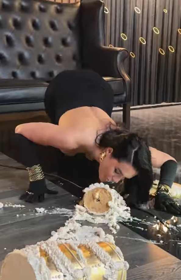 În timp ce încerca să imite alți influenceri care făceau acest trend, Cristina a avut parte de un adevărat fail: tortul spectaculos pe care îl ținea a căzut pe jos. Ambițioasă din fire, ispita a decis să-și continue încercarea și a început să mănânce tortul direct de pe jos, surprinzându-și urmăritorii cu această alegere neobișnuită.