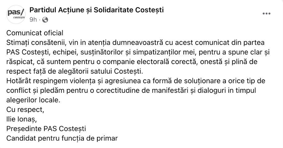 Partidul Acțiune și Solidaritate Costești a emis un comunicat oficial în care se menționează: „respingem violența și agresiunea ca formă de soluționare a orice tip de conflict și pledăm pentru o corectitudine de manifestări și dialoguri in timpul alegerilor locale”.