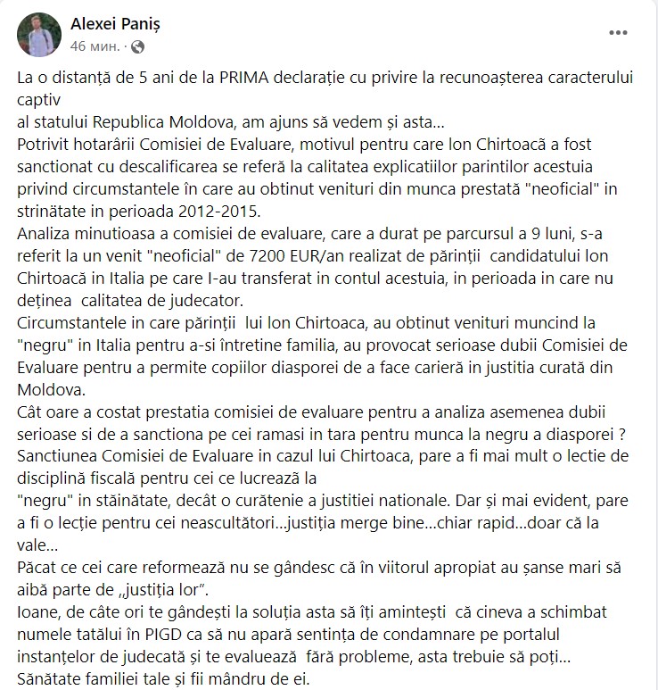 Judecătorul Ion Chirtoacă a declarat pentru UNIMEDIA că va contesta decizia Pre-Vetting la Curtea Supremă de Justiție și a calificat-o drept „o condamnare pentru o generație întreagă de părinți, nevoiți să plece la muncă în străinătate, pentru ca ai lor copii să poată rămâne acasă”.