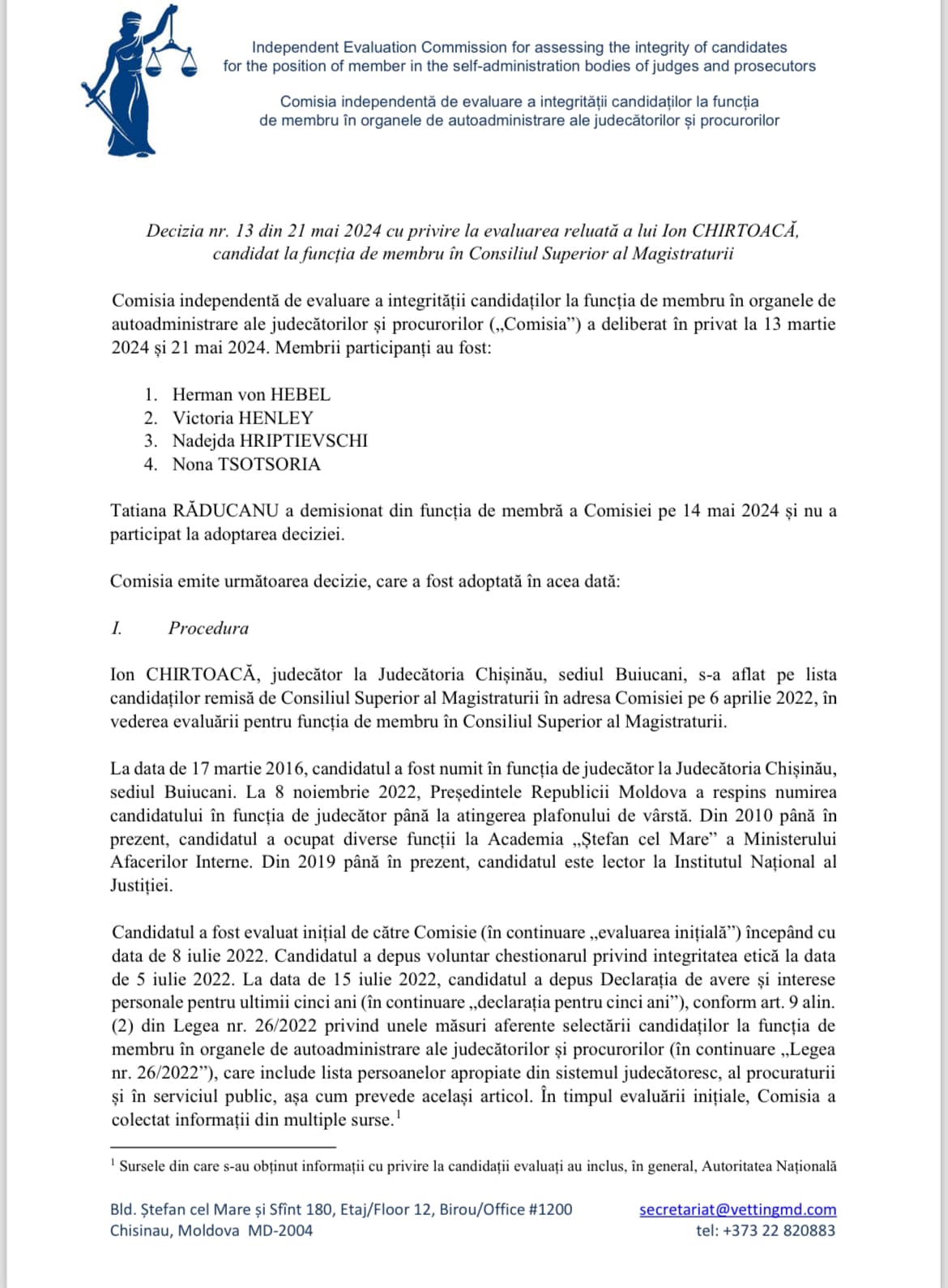 Candidatura magistratului Ion Chirtoacă pentru funcția de membru al Consiliului Superior al Magistraturii a fost respinsă repetat de Pre-Vetting, chiar și după audierea scandaloasă a părinților acestuia. decizia comisiei a fost anunțată pe 24 iunie, la mai bine de trei luni de la audieri.