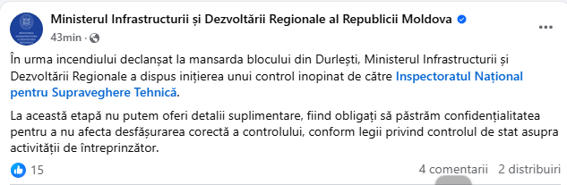 „În urma incendiului declanșat la mansarda blocului din Durlești, Ministerul Infrastructurii și Dezvoltării Regionale a dispus inițierea unui control inopinat de către Inspectoratul Național pentru Supraveghere Tehnică.