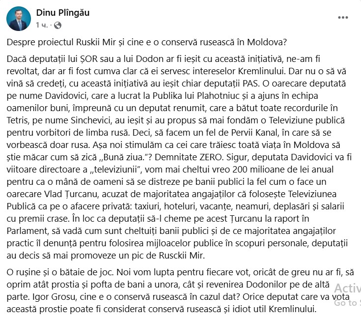 O oarecare deputată pe nume Davidovici, care a lucrat la Publika lui Plahotniuc și a ajuns în echipa oamenilor buni, împreună cu un deputat renumit, care a bătut toate recordurile în Tetris, pe nume Sinchevici, au ieșit și au propus să mai fondăm o Televiziune publică pentru vorbitori de limba rusă. Deci, să facem un fel de Pervii Kanal, în care să se vorbească doar rusa. Așa noi stimulăm ca cei care trăiesc toată viața în Moldova să știe măcar cum să zică „Bună ziua”. Demnitate ZERO.