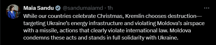 „În timp ce țările noastre sărbătoresc Crăciunul, Kremlinul alege distrugerea — țintind infrastructura energetică a Ucrainei și încălcând spațiul aerian al Moldovei cu o rachetă, acțiuni care încalcă în mod clar dreptul internațional.