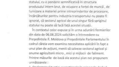 Agricultorii semnatari ai scrisorii îi solicită președintei Maia Sandu să dispună „declararea stării excepționale în raioanele afectate, precum și implementarea unui plan de acțiuni pentru salvarea sectorului agricol”.