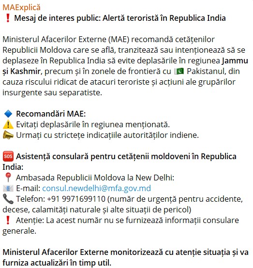 Ambasada Republicii Moldova la New Delhi: E-mail: consul.newdelhi@mfa.gov.md; Telefon: +91 9971699110 (număr de urgență pentru accidente, decese, calamități naturale și alte situații de pericol).