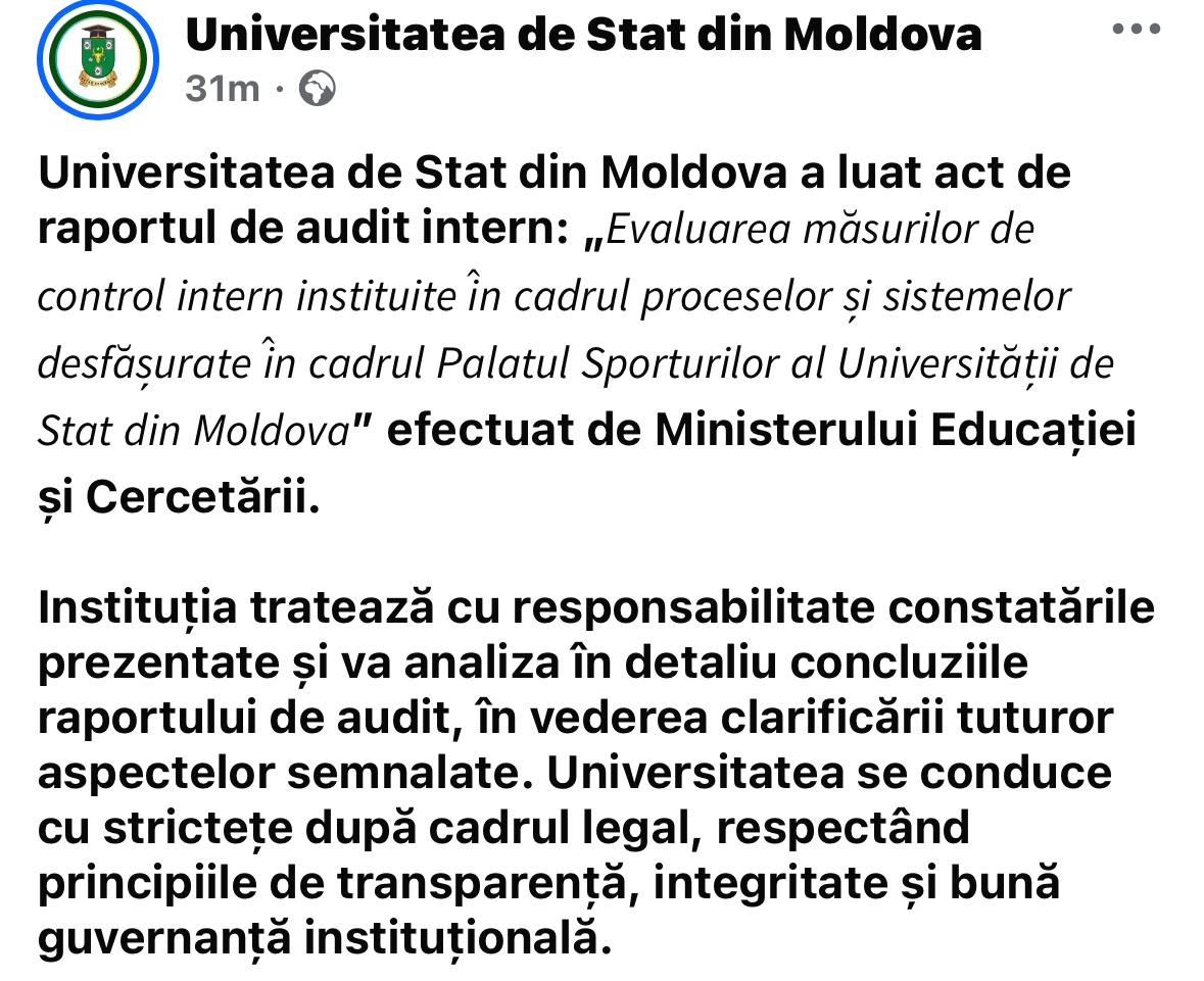 Universitatea de Stat din Moldova (USM) a emis o reacție oficială în urma auditului efectuat de Ministerul Educației și Cercetării (MEC), care a depistat mai multe nereguli financiare în administrarea Palatului Sporturilor. „Instituția tratează cu responsabilitate constatările prezentate și va analiza în detaliu concluziile raportului de audit”, precizează USM.