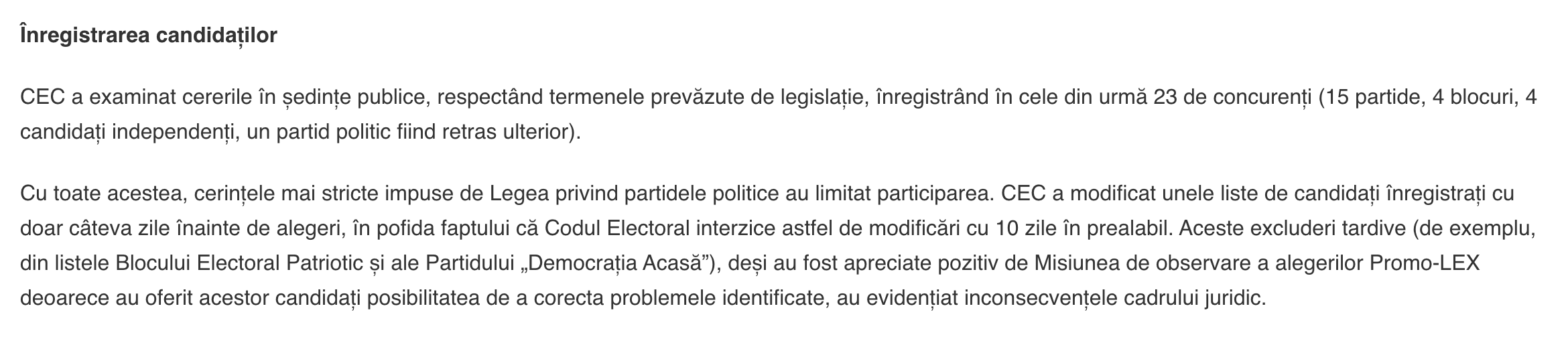 „Cerințele mai stricte impuse de Legea privind partidele politice au limitat participarea. CEC a modificat unele liste de candidați înregistrați cu doar câteva zile înainte de alegeri, în pofida faptului că Codul Electoral interzice astfel de modificări cu 10 zile în prealabil. Aceste excluderi tardive (de exemplu, din listele Blocului Electoral Patriotic și ale Partidului „Democrația Acasă”), deși au fost apreciate pozitiv de Misiunea de observare a alegerilor Promo-LEX deoarece au oferit acestor candidați posibilitatea de a corecta problemele identificate, au evidențiat inconsecvențele cadrului juridic”, se arată în declarație.