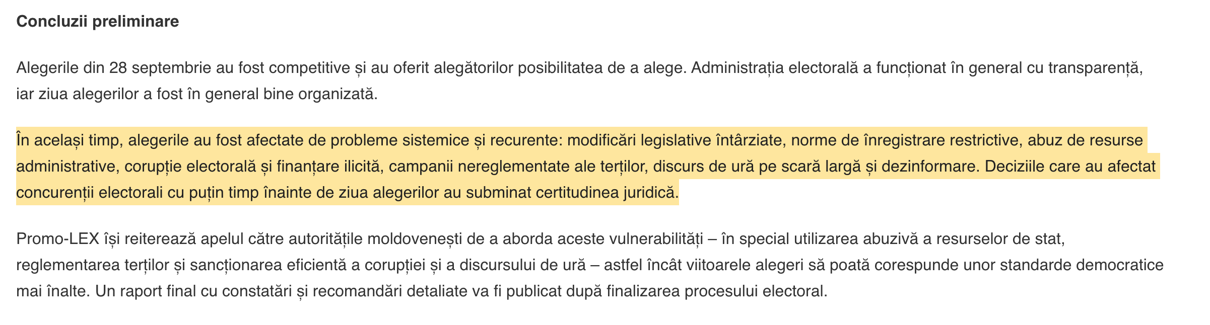 „În același timp, alegerile au fost afectate de probleme sistemice și recurente: modificări legislative întârziate, norme de înregistrare restrictive, abuz de resurse administrative, corupție electorală și finanțare ilicită, campanii nereglementate ale terților, discurs de ură pe scară largă și dezinformare. Deciziile care au afectat concurenții electorali cu puțin timp înainte de ziua alegerilor au subminat certitudinea juridică”, mai menționează observatorii.
