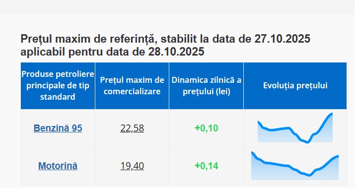 Agenția Națională pentru Reglementare în Energetică (ANRE) a publicat noile prețuri maximale de referință pentru data de 28 octombrie 2025, care indică o ușoară creștere la ambele tipuri de carburanți principali.