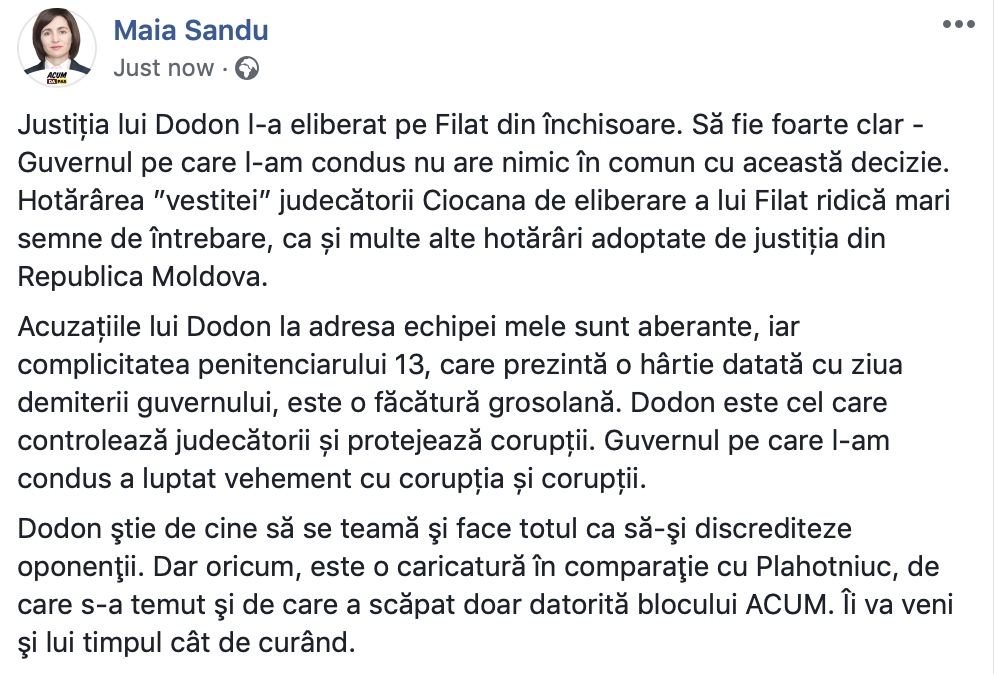 „Acuzațiile lui Dodon la adresa echipei mele sunt aberante, iar complicitatea penitenciarului 13, care prezintă o hârtie datată cu ziua demiterii guvernului, este o făcătură grosolană. Dodon este cel care controlează judecătorii și protejează corupții. Guvernul pe care l-am condus a luptat vehement cu corupția și corupții.